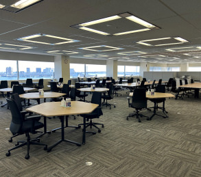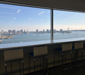 窓側のカウンターデスクでは、東京湾を眺めながら作業できます!2021年にリニューアルを行い、新たなコミュニケーションが生まれるオフィスになりました。
