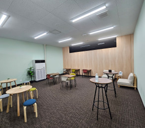 設計開発オフィスにある休憩スペースです。若手従業員を中心としたプロジェクトメンバーが意見を出し合い、企画の立案から施工まで積極的にリードして完成しました。仕事中にホッと一息つける空間です。
