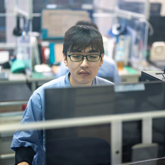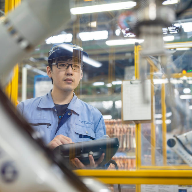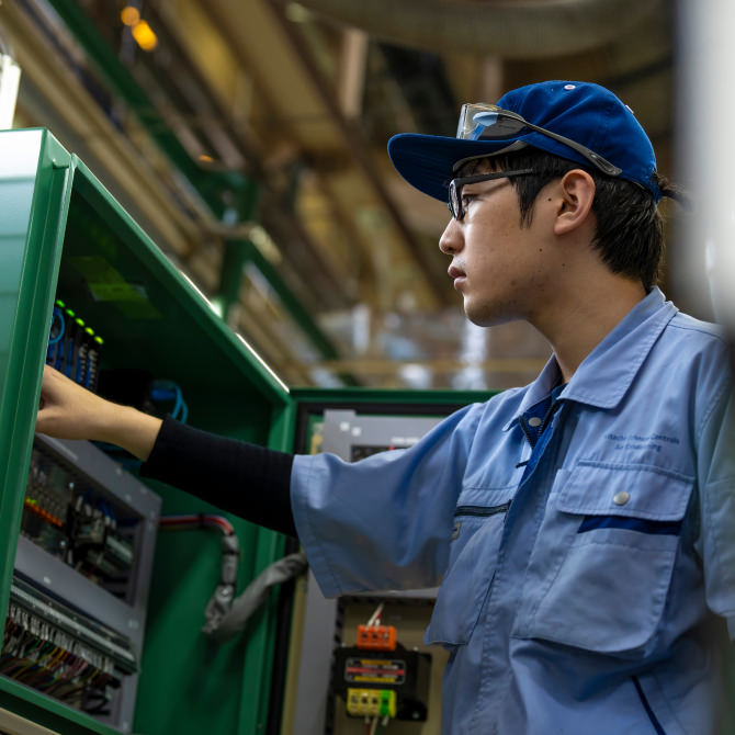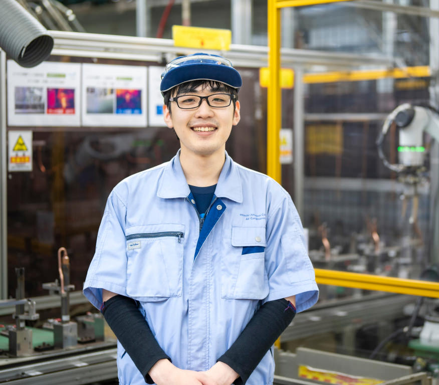 家庭用ルームエアコンの室外機に使われる部品の製造ラインで、自動化設備の導入と調整を担当しています。新たな設備にかかる予算と費用対効果を検討し、社内提案を行い、予定通りの立ち上げと不具合対応までを一手に引き受けます。直近で携わったのは「協働ロボット」。安全のために人間と隔てなければならなかった従来のロボットと異なり、ロボットの近くで人間が一緒に作業できるため、スペースや工程のムダを削減できます。今は、さらに協働ロボットのポテンシャルを引き出すための検討を行っているところです。