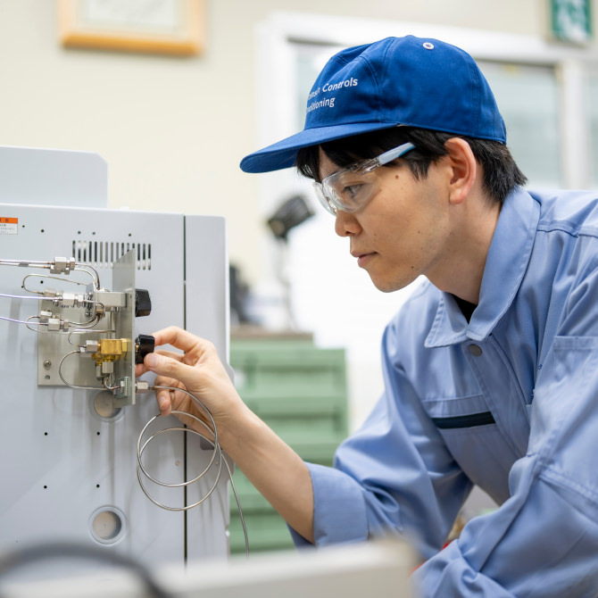 空調機器に封入される化学物質の研究開発を行っています。熱の移動に用いられる「冷媒」や、冷媒を圧縮するコンプレッサーの潤滑に使われる「冷凍機油」です。新たに開発された冷媒を使って空調機器の試運転を行い、使用後の冷媒を分析したり、冷媒と冷凍機油との化学反応性を確認したりすることが主な業務です。特に冷媒は、環境性能の徹底的な追求が求められる物質。私自身は冷媒に着手してまだ日が浅いのですが、新技術を1日でも早く世界に送り出すために、責任感とスピード感をもって研究を進めていきたいと思っています。