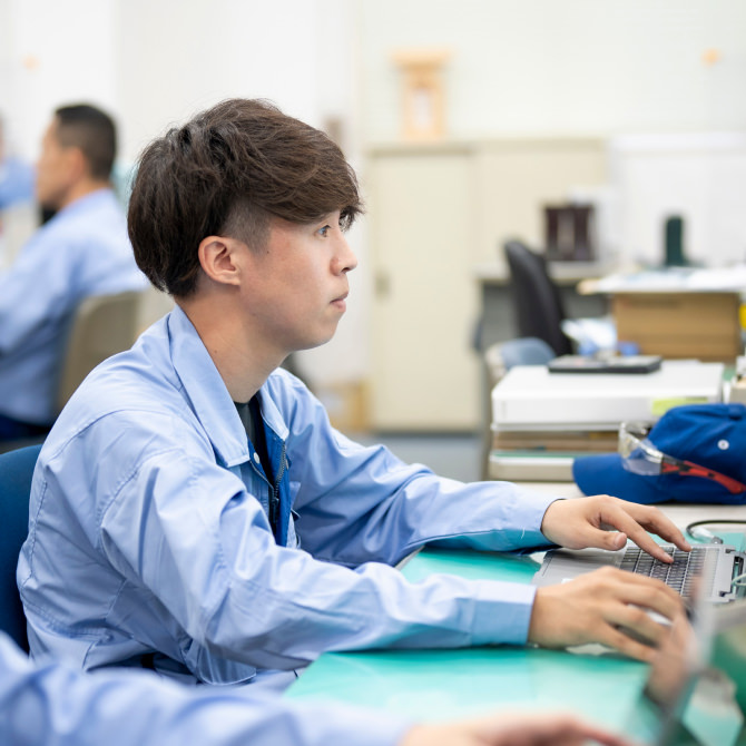 生産設備の新規導入や、既存設備の改善に従事しています。仕事のボリュームとしては、設備の改善がいちばん大きいですね。特に最近では、省エネ性能の向上に取り組むことが増えています。私が担当しているのは、樹脂加工の設備と、金属で構造物をつくる製缶加工の設備。まったく性質の異なる2種類の材料を見ることになるのですが、いろいろやることが好きな私には向いています(笑)。また、生産に必要な治具の設計や製作も、樹脂部品と金属溶接部品の両方を手がけています。