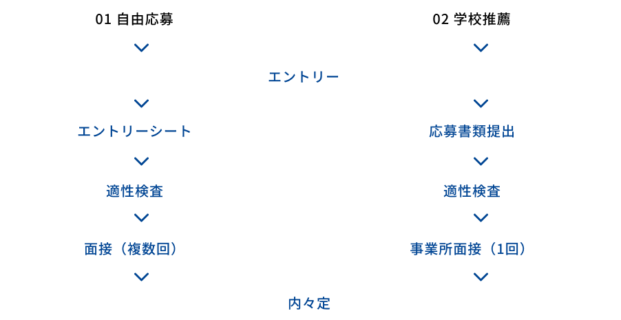 以下2つの方法で応募を受付けています。 01 自由応募(技術系・事務系総合職ご希望の方)当社新卒採用ホームページ内の「エントリー」ボタンよりエントリーください。 02 学校推薦(技術系総合職ご希望の方)下記応募書類を下記送付先まで郵送してください。選考に関する情報は、別途ご案内します。