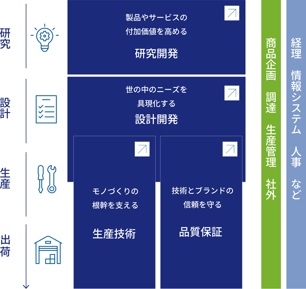 生産方法・方式、効率的な仕組みを考え、モノづくりを支える「生産ラインの技術エキスパート」です。「生産量の拡大」と「生産効率の向上」を実現するため、 ライン設備の構築や生産効率の向上に向けた新技術・新設備の導入など生産技術の開発・実用化を行う仕事です。
